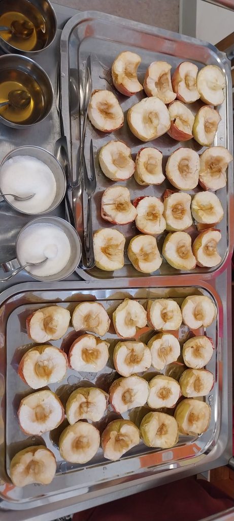 Već idućeg tjedan, odgojiteljice Jelena i Vesna pripremile su novo zajedničko druženje u našem vrtiću.  Uz igre i aktivnosti, djeca su imala priliku čistiti, peći i degustirati jabuke, a usput i naučiti nešto ovom voću.